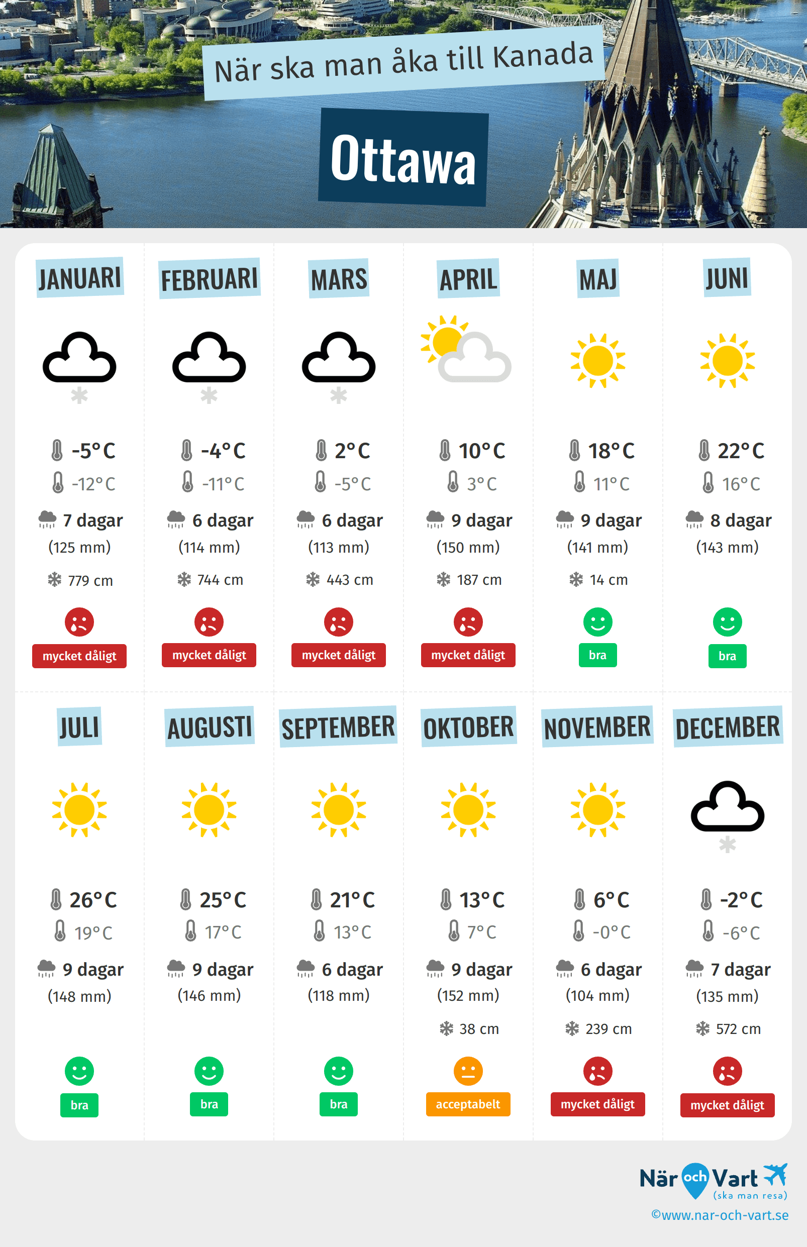 - De bästa månaderna för bra väder i Ottawa är Maj, Juni, Juli, Augusti och September